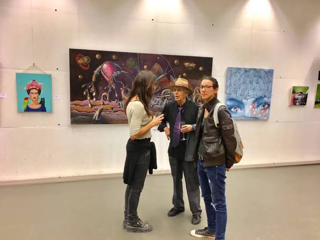Presentación colectiva de la revista La Ruta del Arte en el Palacio de Congresos de Santa Eulalia. En la foto (de izquierda a derecha) mi querida amiga y expectacular música argentina Marian Pellegrino, el pintor y músico Dirk y yo charlando delante de mi obra Biodecodificación.