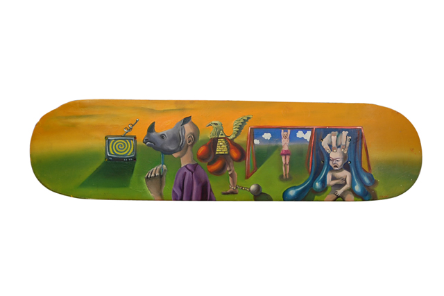 Painted on a recycled skateboard deck, this work was born in San Francisco (USA), talks about «a democracy with invisible chains» (words of Aldous Huxley).