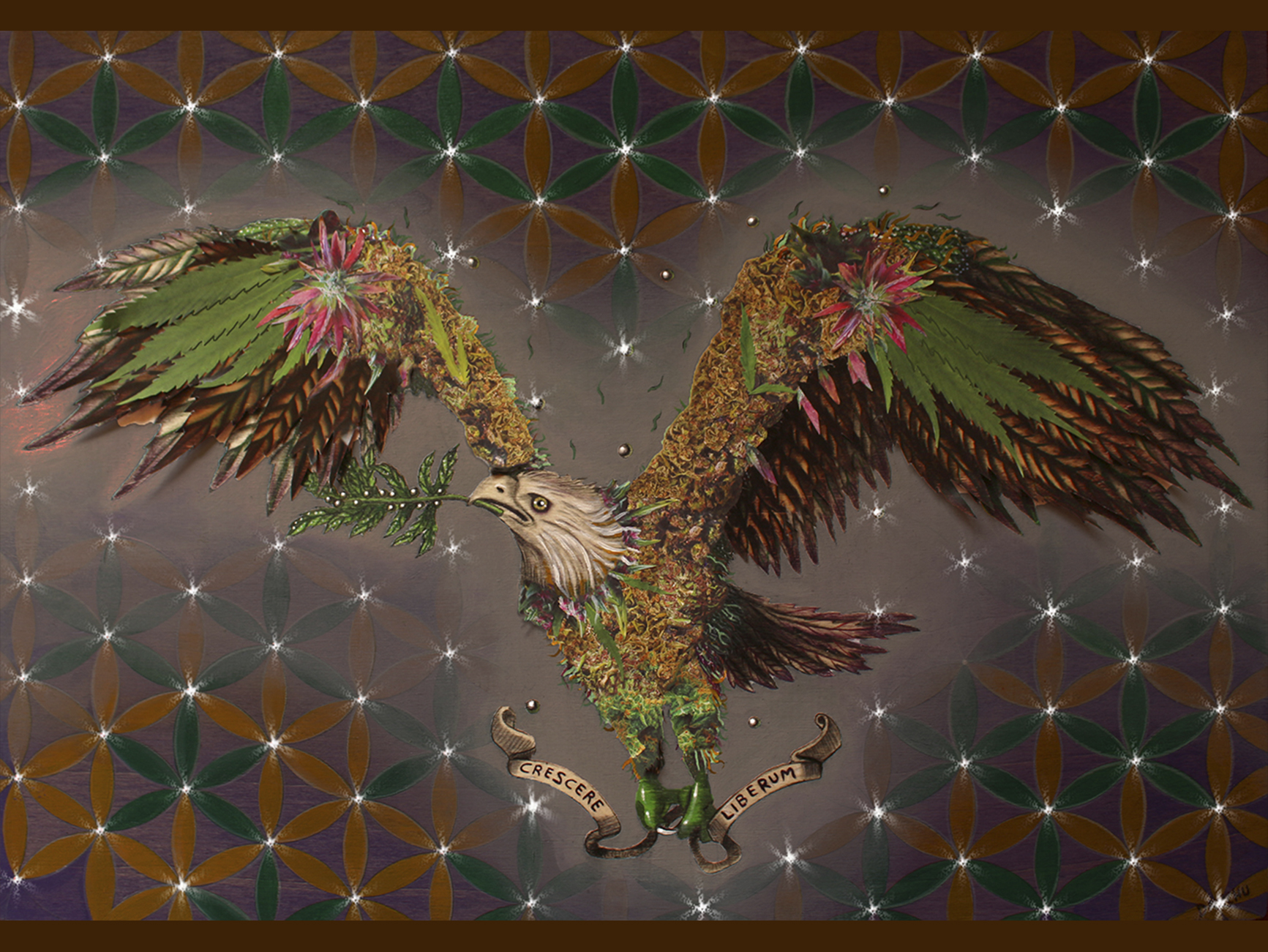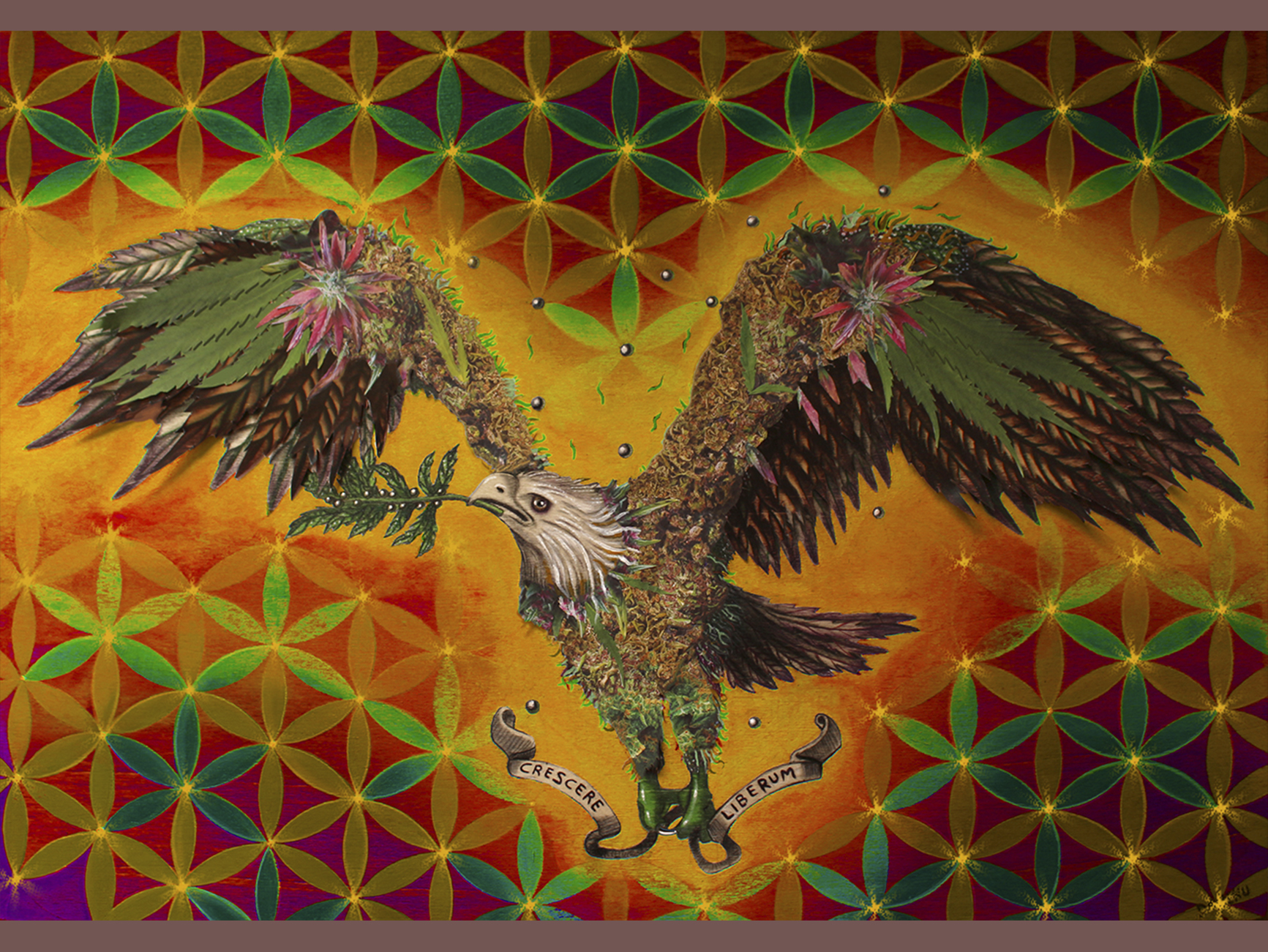 I did 4 series of the Eagle for this contest (this is the 4th), the idea is an Eagle made of cannabis, the feathers are weed leaves, the body weed´s flowers… (GrowFree is an acrylic painting on Wood, 50x35cm; Growfree 2 and 3 are a handmade collage, and GrowFree 4 is a collage made with photoshop on top of the previous painting).