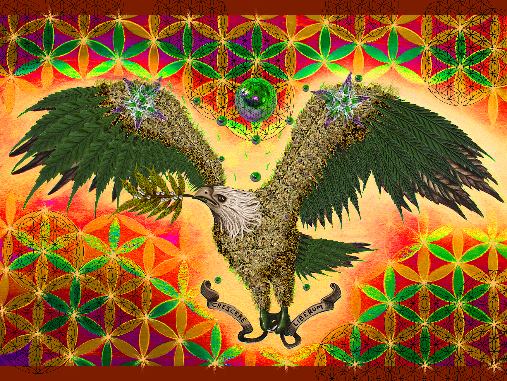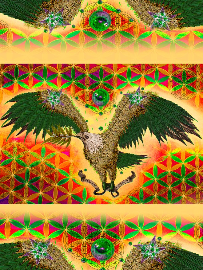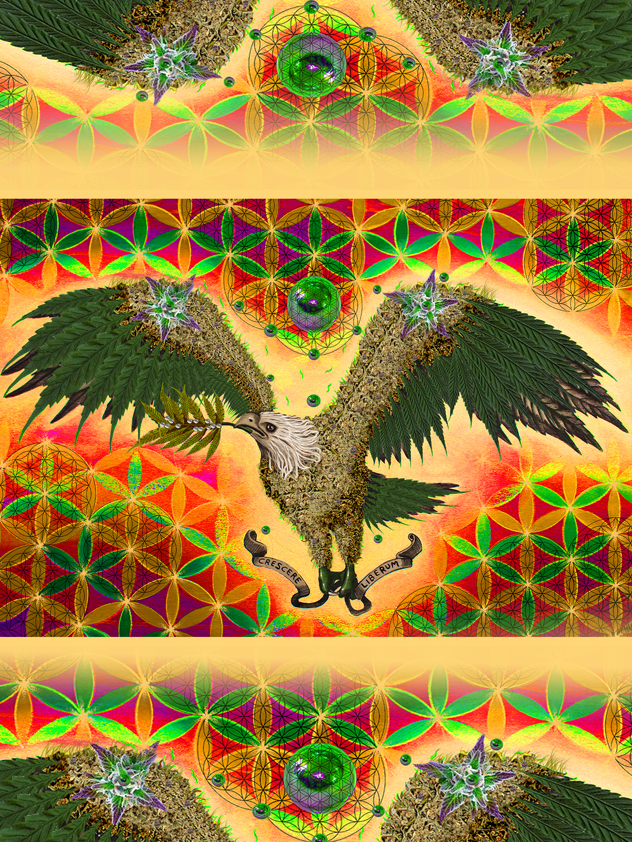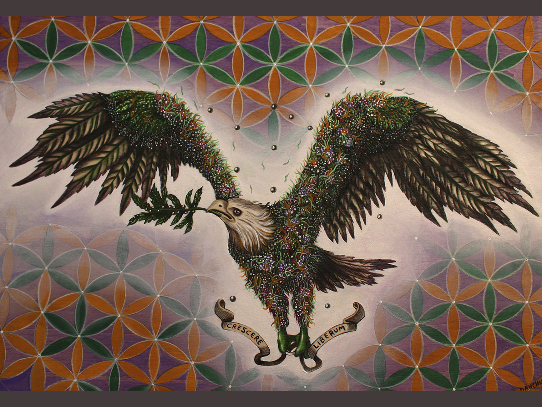 Grow Free is the theme, within the theme of Freedom, that I have chosen due to the current global laws and rooted fake beliefs. It is a shame that alcohol (which only harms health) is legal and Marihuana, which is far greater substance that can help with diseases such as cancer or parkinson and yet is illegal… I have chosen the Eagle because it’s a great symbol of the United States and in history appears many times as a symbol representing strength, dominance and salvation. I was inspired on the Eagle that appears on the one dollar bill and instead of giving the message of “all for one” , “out of many, one”, or “one from many” (in Latin “Pluribus Unum”), my eagle carries “Crescere Liberum» (in Latin Grow Free). On the background I painted the flower of life because I feel that is the symbol of connectivity of All…