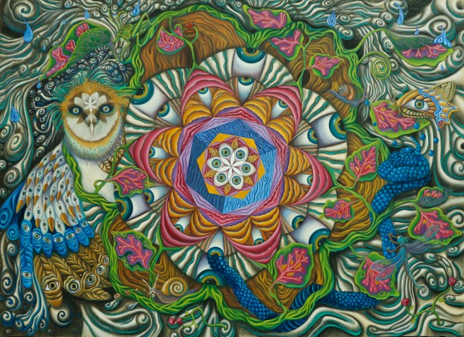 Observar la biodiversidad de la naturaleza en el jardín me dio la inspiración para comenzar esta pintura. Mientras pintaba visualizaba mi corazón expandiéndose y conectándose con el logos “la gran Unidad de la Realidad” (Heráclito) que traduje en formas y colores en esta pintura. Cuando ahora lo miro con mente racional veo en el Centro una Flor que representa el Chakra de mi corazón, el Chakra del corazón de la naturaleza expandiéndose y creando vida y armonía entre todos los seres vivos. Hay otra pieza escondida en la parte posterior del cuadro, un rostro de aspecto caricaturesco con dos flores de la vida como ojos sobre un fondo verde con la frase LA MAGIA SUCEDE CUANDO UNO ESTÁ OBSERVANDO, NO RAZONANDO.