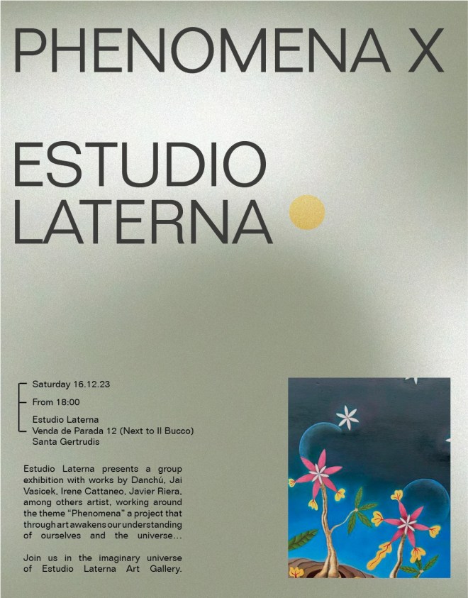 Estudio Laterna Art Gallery presenta Phenomena un proyecto, en el que participo con seis obras, que a través del arte despierta el entendimiento sobre nosotros/as mismos/as y el universo. Esta Fenomenal exhibición en la que también participan Jai Vasicek, Irene Cattaneo y Javier Riero está curada por Andrea Sanchez V.