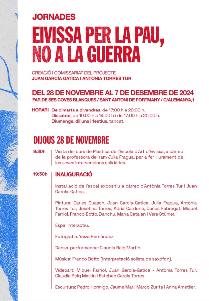 EXPOSICIÓN COLECTIVA- IBIZA POR LA PAZ, NO A LA GUERRA – JUEVES 28 DE NOVIEMBRE 19:30 Publicado el 10 noviembre, 20249 diciembre, 2024 por danchuart View this post on Instagram A post shared by Danchú (@danchuart) Compártelo: Haz clic para compartir en X (Se abre en una ventana nueva) X Haz clic para compartir en Facebook (Se abre en una ventana nueva) Facebook Me gusta Cargando... Relacionado