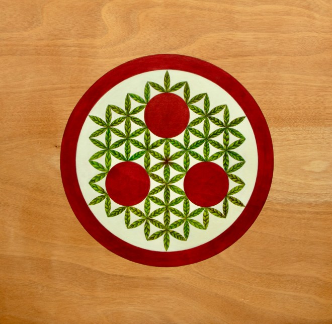 This work “Peace on Earth, in Memory of Nicholas Roerich” is intended to remember the ROERICH legacy in times when war is found in every corner of the planet. Maintains the objective of raising awareness about the importance that culture exerts on humanity: the cultural value of spirituality, science and art to enrich, beautify and promote the unity of cultural diversity (education of intercultural perspectives and respect for difference ), as well as Universal Peace. I have added in its center the “Heart of the Earth”, where natural leaves emerge from the Flower of Creation forming a cube or hexahedron, alchemical symbol of Plato’s Earth in his work «Timaeus». The work thus highlights, like the original, humanity’s responsibility to preserve the diversity of these areas represented by the spheres (spirituality, art and science), and adds that of preserving the biodiversity of our Mother Earth.